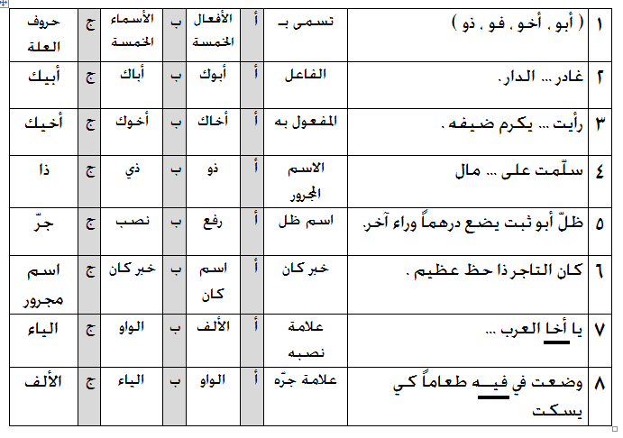 اختبار وحدة نوادر وقيم الاسماء الخمسة الثاني المتوسط ف1 1439