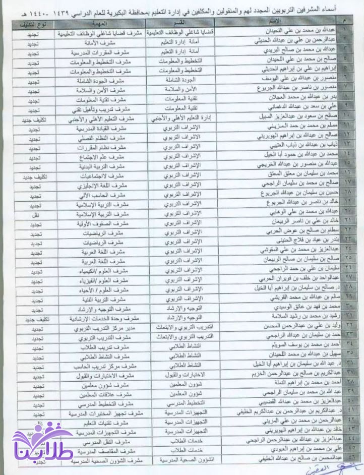 اعتمد سعادة مدير تعليم البكيرية الدكتور خالد بن راجح الراجح، عدداً من التكليفات وقرارات التجديد لعدد من شاغلي الوظائف التعليمية (بنين وبنات ) وذلك للعمل ضمن التشكيلات الإشرافية والمدرسية للعام الدراسي 1440/1439 هـ وذكر مساعد المدير للشؤون التعليمية ( بنين) ورئيس اللجنة الفرعية للتشكيلات الإشرافية الأستاذ محمد بن علي القضيبي أن قرار التشكيلات الإشرافية تضمنت تجديد ونقل وتكليف عدد (98) مشرفاً ومشرفة، كما ذكر مساعد المدير للشؤون المدرسية الأستاذ عبدالله بن محمد العقيلي أن قرار التشكيلات المدرسية تضمن عدد (48) مرشدًا ومرشدة وعدد (25) أميناً وأمينة مصادر تعلم وعدد (6) رائدًا ورائدة نشاط .