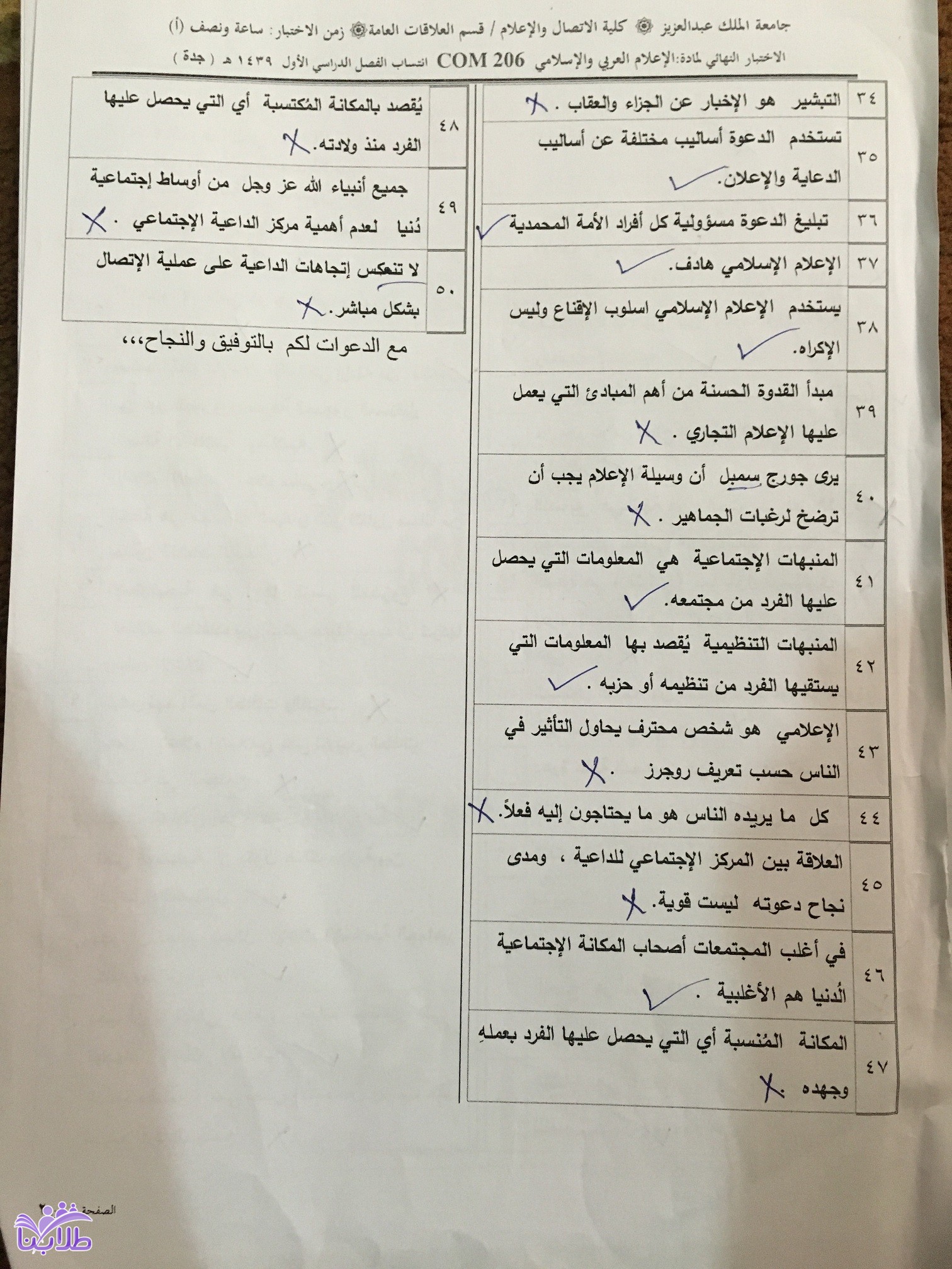 اختبار مادة الإعلام العربي والاسلامي com206 ف1 جامعة الملك عبدالعزيز 1439 هـ