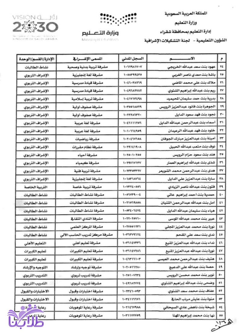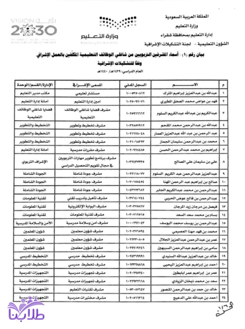 أعلنت إدارة التعليم بمحافظة شقراء، تكليف (٦٨) معلماً و(٥٨) معلمة للعمل في الإشراف التربوي حتى نهاية عام ١٤٣٩ / ١٤٤٠ هـ؛ وذلك وفقًا لآلية التشكيلات الإشرافية.