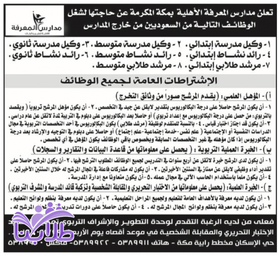 التقديم ساري حتى يوم غدٍ الأربعاء الموافق 29-2-1440هـ في وحدة التطوير والإشراف التربوي تمهيداً لتحديد الاختبار التحريري والمقابلة الشخصية – حي الإسكان – مخطط رابية مكة