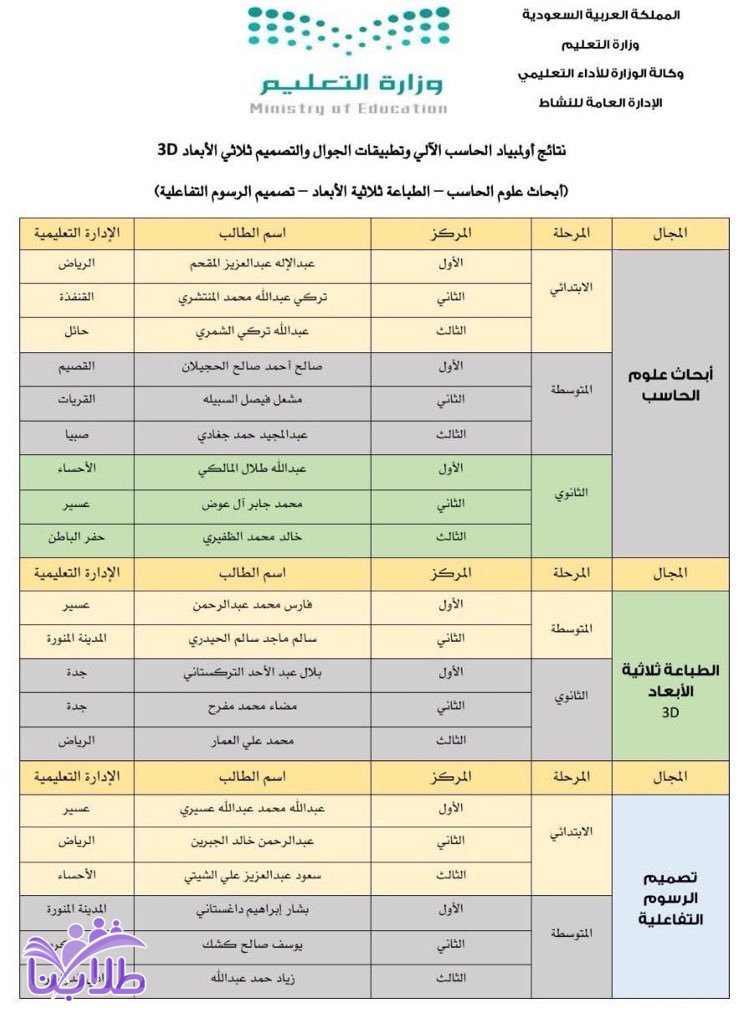 اعلنت الإدارة العامة للنشاط العلمي بوكالة الأداء التعليمي في وزارة التعليم عن نتائج أولمبياد الحاسب الآلي وتطبيقات الهاتف والتصميم ثلاثي الأبعاد لعام 1439-1440 هـ.