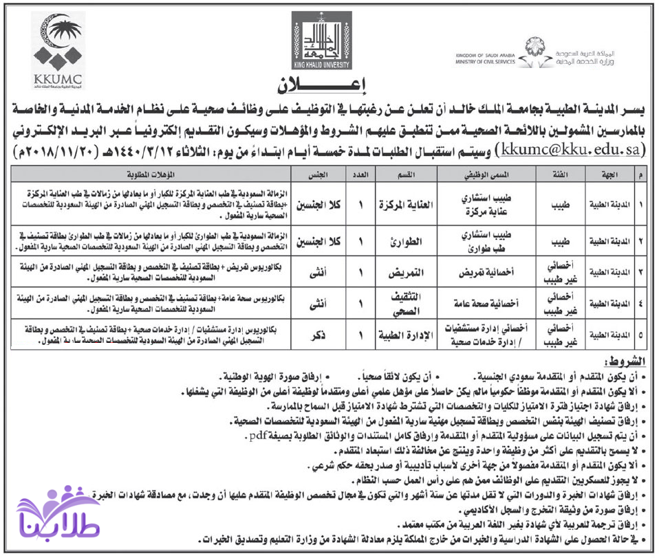جامعة الملك خالد تعلن عن وظائف صحية للجنسين على نظام الخدمة المدنية والخاصة بالممارسين المشمولين باللائحة الصحية
