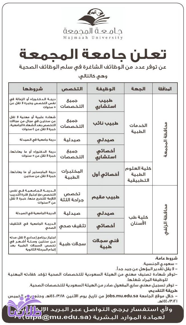 جامعة المجمعة تعلن عن وظائف صحية بالخدمات الطبية وكلية العلوم الطبية التطبيقية وكلية طب الأسنان