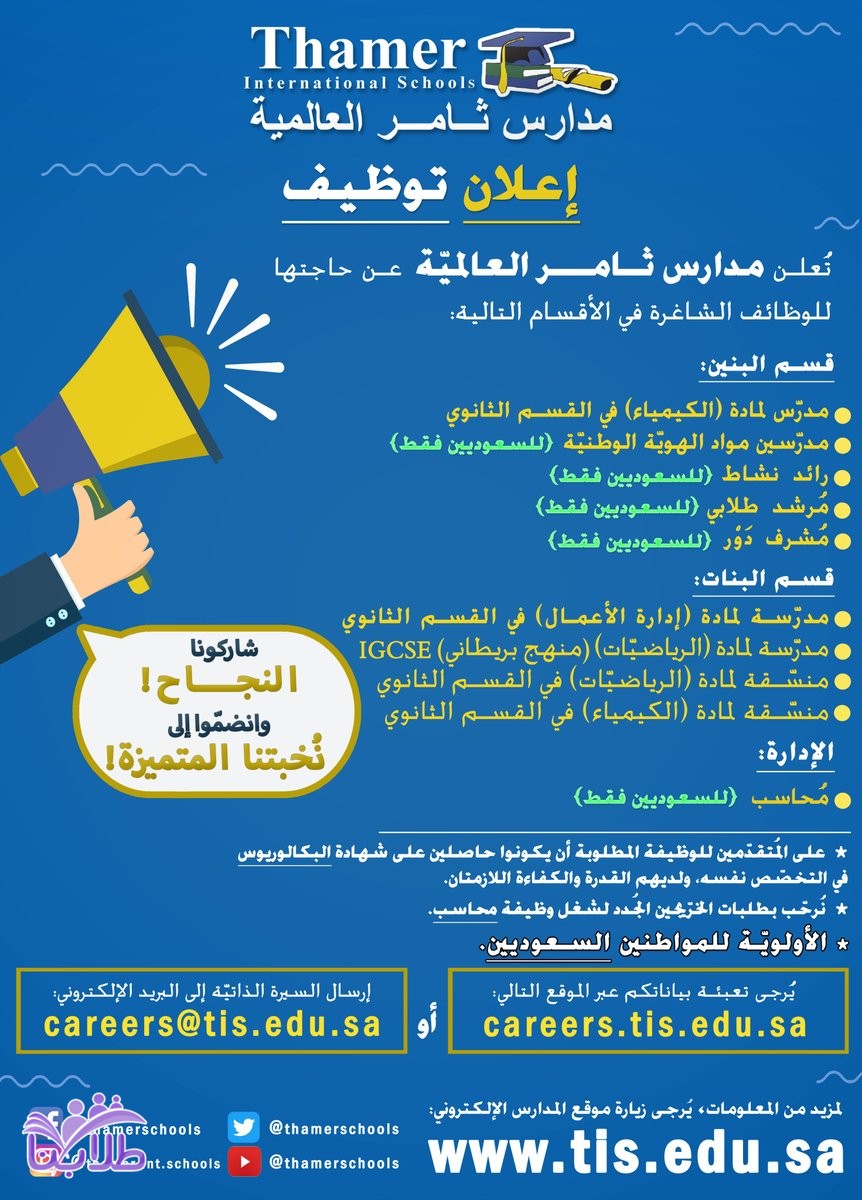 مدارس ثامر العالمية بمحافظة جدة تعلن عن وظائف ادارية وتعليمية للرجال والنساء