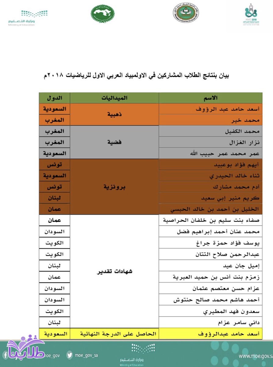 أعلنت اللجنة المنظمة بإدارة التعليم العام بمنطقة جدة عن النتائج النهائية للطلاب المشاركين في اولمبياد الرياضيات العربي الاول لعام ٢٠١٨م.