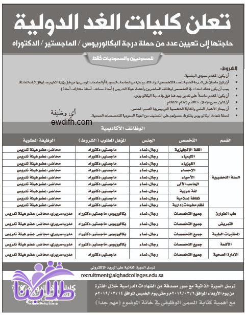 إرسال السيرة الذاتية إلى البريد الإلكتروني (مع ضرورة كتابة مسمى الوظيفة بالعنوان) : [email protected]