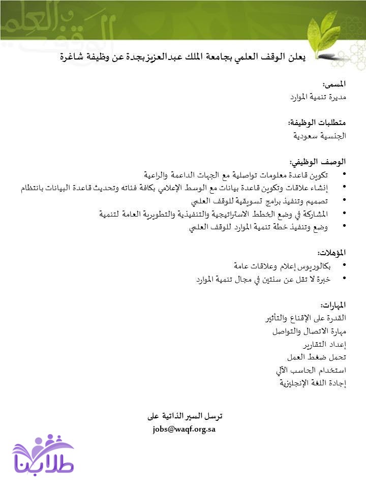2- مديرة تنمية الموارد (للنساء فقط): – بكالوريوس إعلام وعلاقات عامة. – خبرة لا تقل عن سنتين في مجال تنمية الموارد.