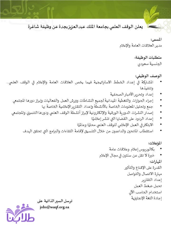 3- مدير العلاقات العامة والإعلام (للرجال فقط): – بكالوريوس إعلام وعلاقات عامة. – خبرة لا تقل عن سنتين في مجال تنمية الموارد.