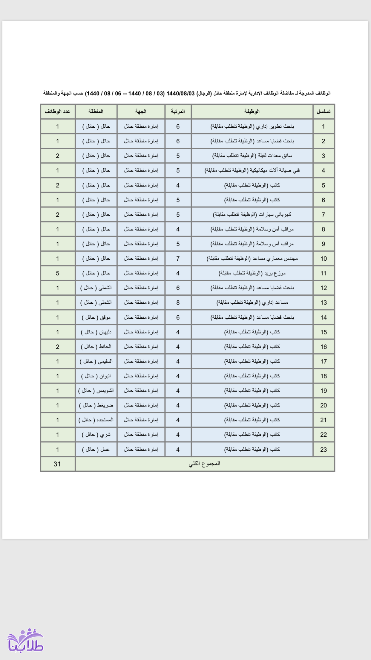 أعلنت إمارة حائل عن وظائف إدارية بسلم رواتب الموظفين العام للمواطنين الحاصلين على الدرجات العلمية والتخصصات المناسبة لشغل الوظائف المعلنة.