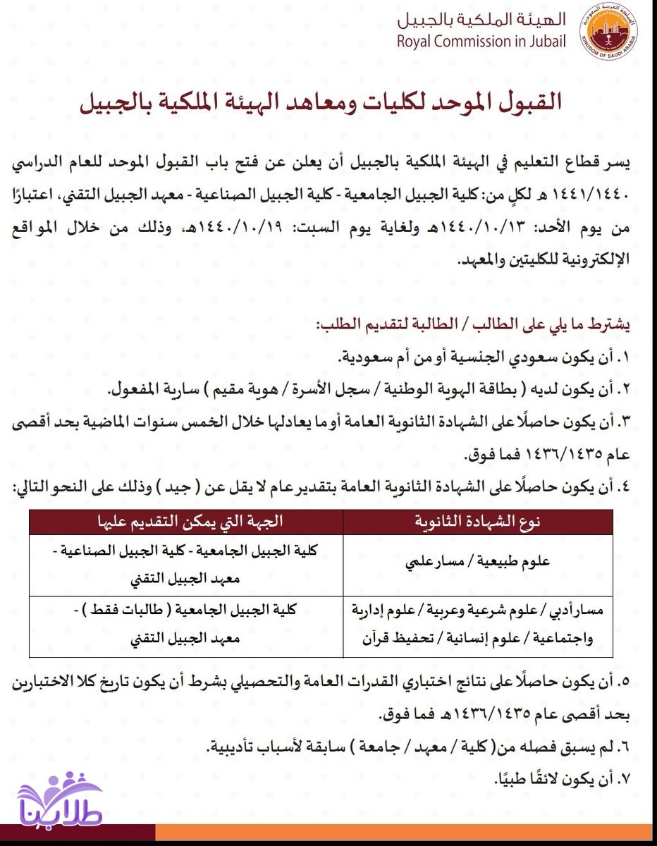 أعلنت الهيئة الملكية بالجبيل عن فتح باب القبول الموحد بقطاع التعليم للعام الدراسي 1440-1441هـ في كلية الجبيل الصناعية، كلية الجبيل الجامعية، معهد الجبيل التقني.