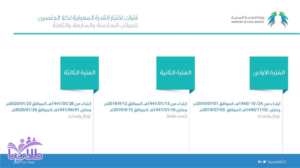 وأعلنت بأنه سيتم البدء بتطبيق اختبار القدرة المعرفية على كلا الجنسين ابتداء من 1441/02/02هـ الموافق 2019/10/02م؛ حيث تطبق وزارة الخدمة المدنية حالياً عدد من الاختبارات المعرفية للمفاضلات الوظيفية، وسيتم إضافة اختبار (القدرة المعرفية) لهذه الاختبارات حرصاً على العدالة والمساوة بين جميع المتقدمين من خريجي المؤسسات التعليمية المختلفة الحكومية والأهلية.
