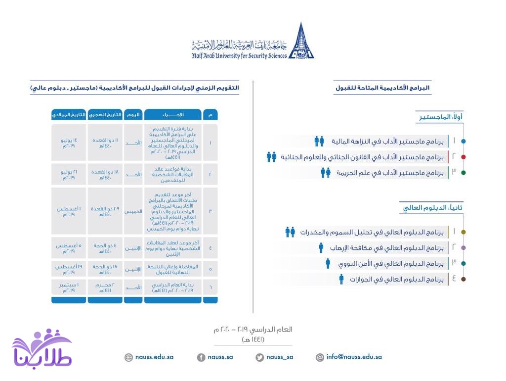 أعلنت جامعة نايف العربية للعلوم الأمنية عن مواعيد التسجيل للجنسين في البرامج الاكاديمية ( الماجستير والدبلوم العالي ) للعام الدراسي 1441هـ.