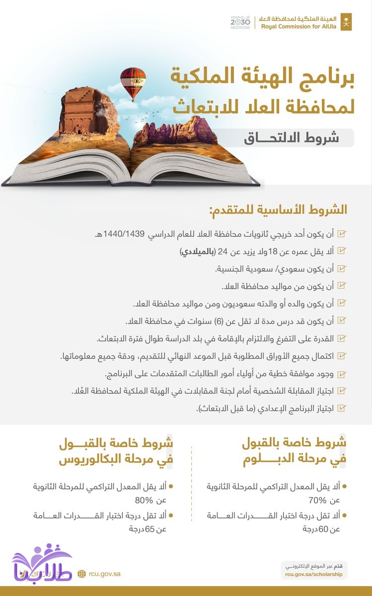 اعلنت الهيئة الملكية لمحافظة العلا عن بدء المرحلة الثانية من برنامج الهيئة الملكية للابتعاث للجنسين من خريجي ثانويات محافظة العلا للعام الدراسي 1440/1439هـ.