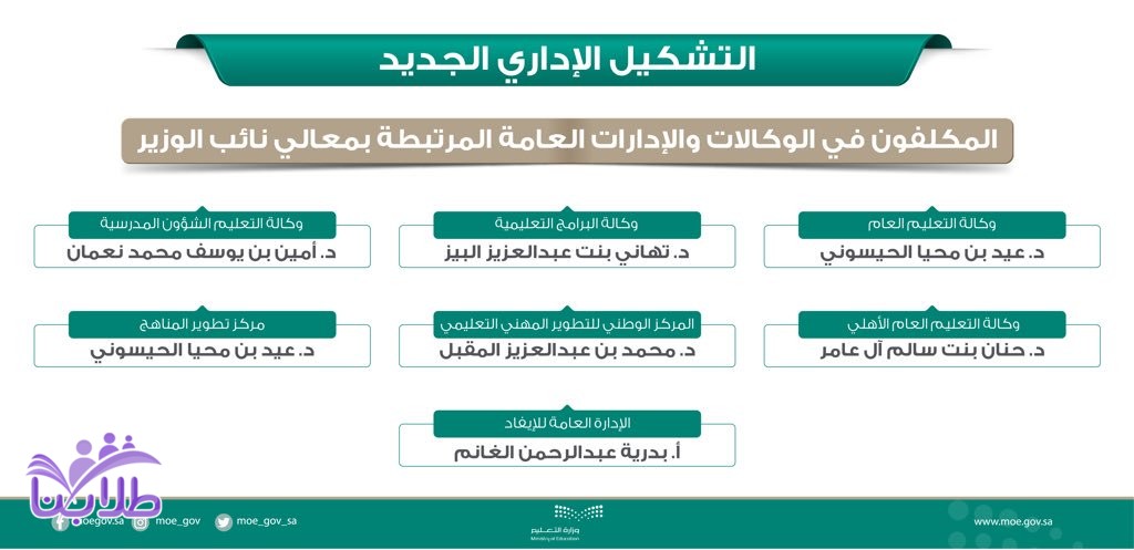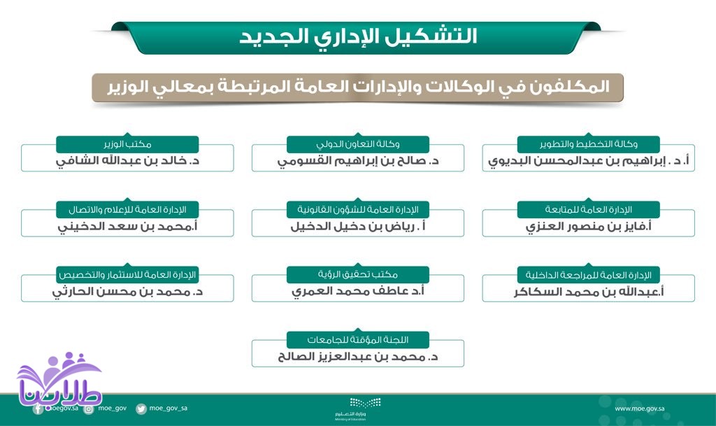 أعتمد معالي وزير التعليم الدكتور حمد بن محمد آل الشيخ قرارات التشكيل الإداري الجديد بالوزارة على مستوى الوكلاء ومديري العموم بما يتوافق مع هيكلة وزارة التعليم، ويحقق العمل على تطوير العمل التعليمي العام والجامعي، متمنياً لهم التوفيق.