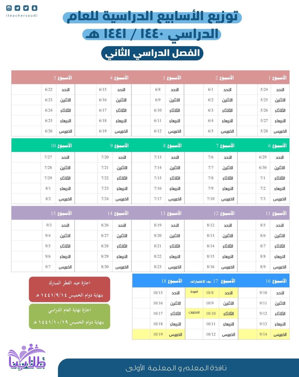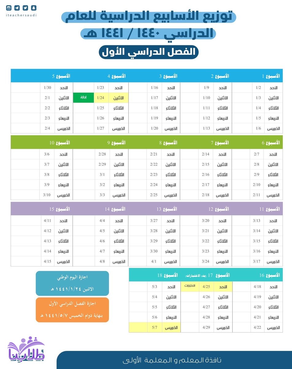 توزيع الأسابيع الدراسية للفصل الدراسي الأول والثاني لعام 1440-1441