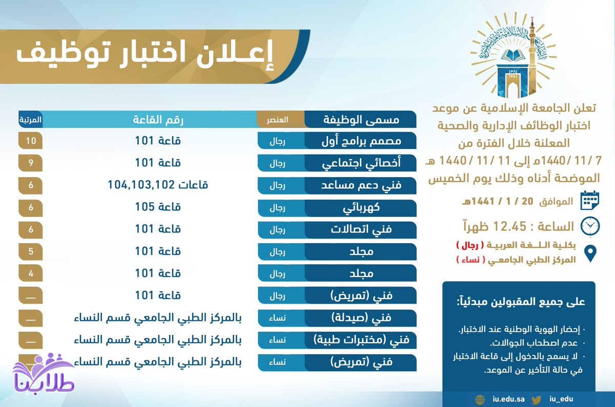 إعلان مواعيد اختبار الوظائف الادارية والصحية بالجامعة الإسلامية