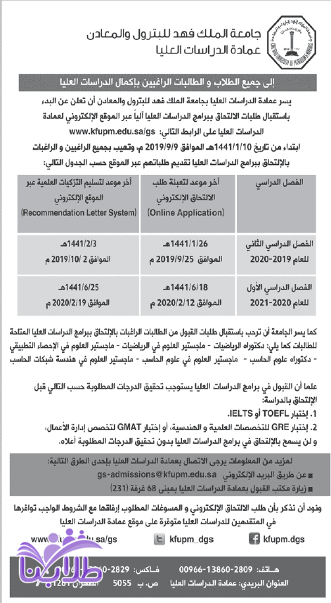 أعلنت جامعة الملك فهد للبترول والمعادن عن فتح باب التقديم على برامج الدراسات العليا للطلاب والطالبات (دكتوراه-ماجستير) للفصل الثاني 2019-2020م