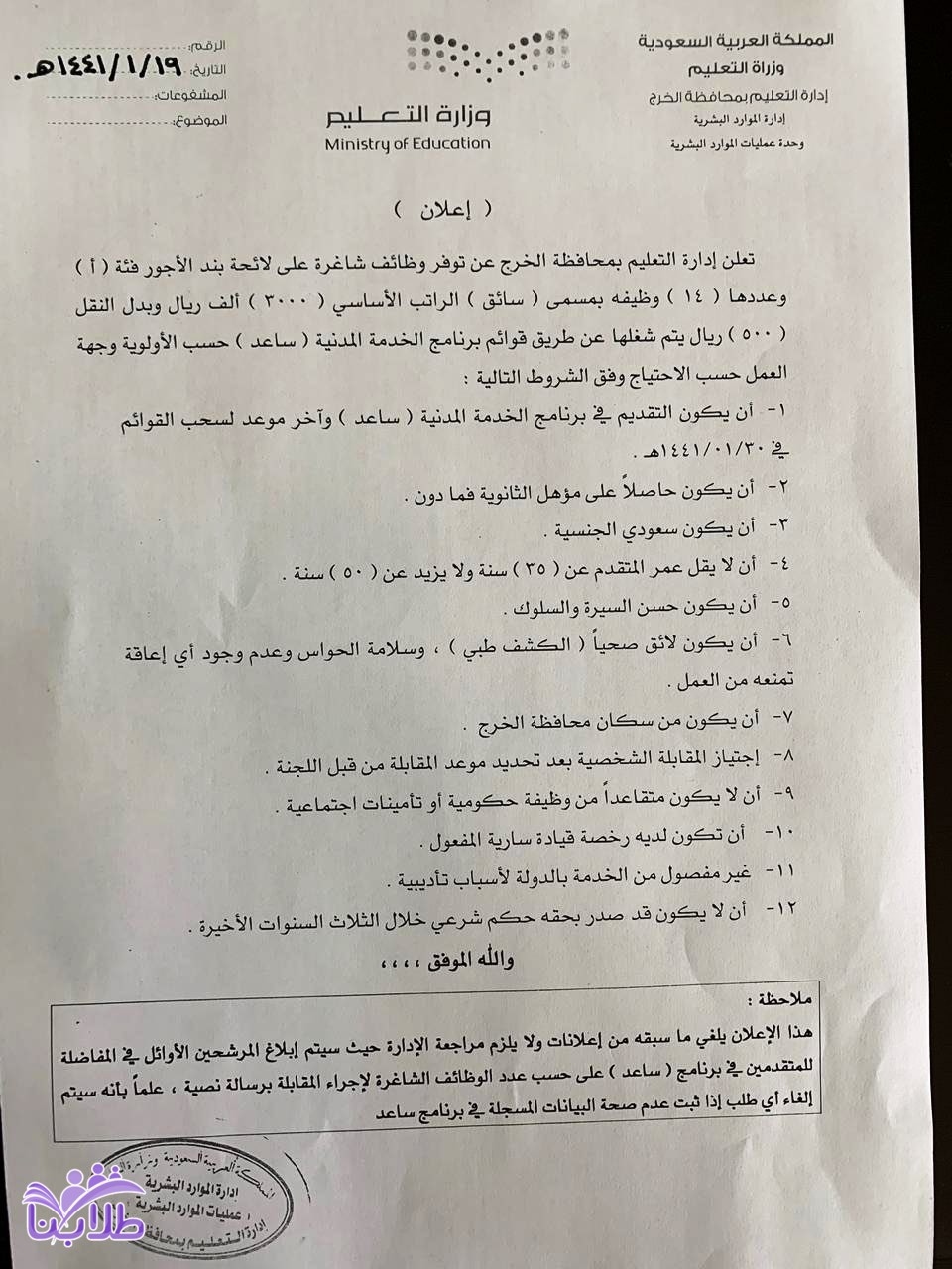 هذا الإعلان يلغي ما سبقه من إعلانات ولا يلزم مراجعة الإدارة حيث سيتم إبلاغ المرشحين الأوائل في المفاضلة للمتقدمين في برنامج (ساعد) على حسب عدد الوظائف الشاغرة لإجراء المقابلة برسالة نصية، علماً بأنه سيتم إلغاء أي طلب إذا ثبت عدم صحة البيانات المسجلة في برنامج (ساعد).