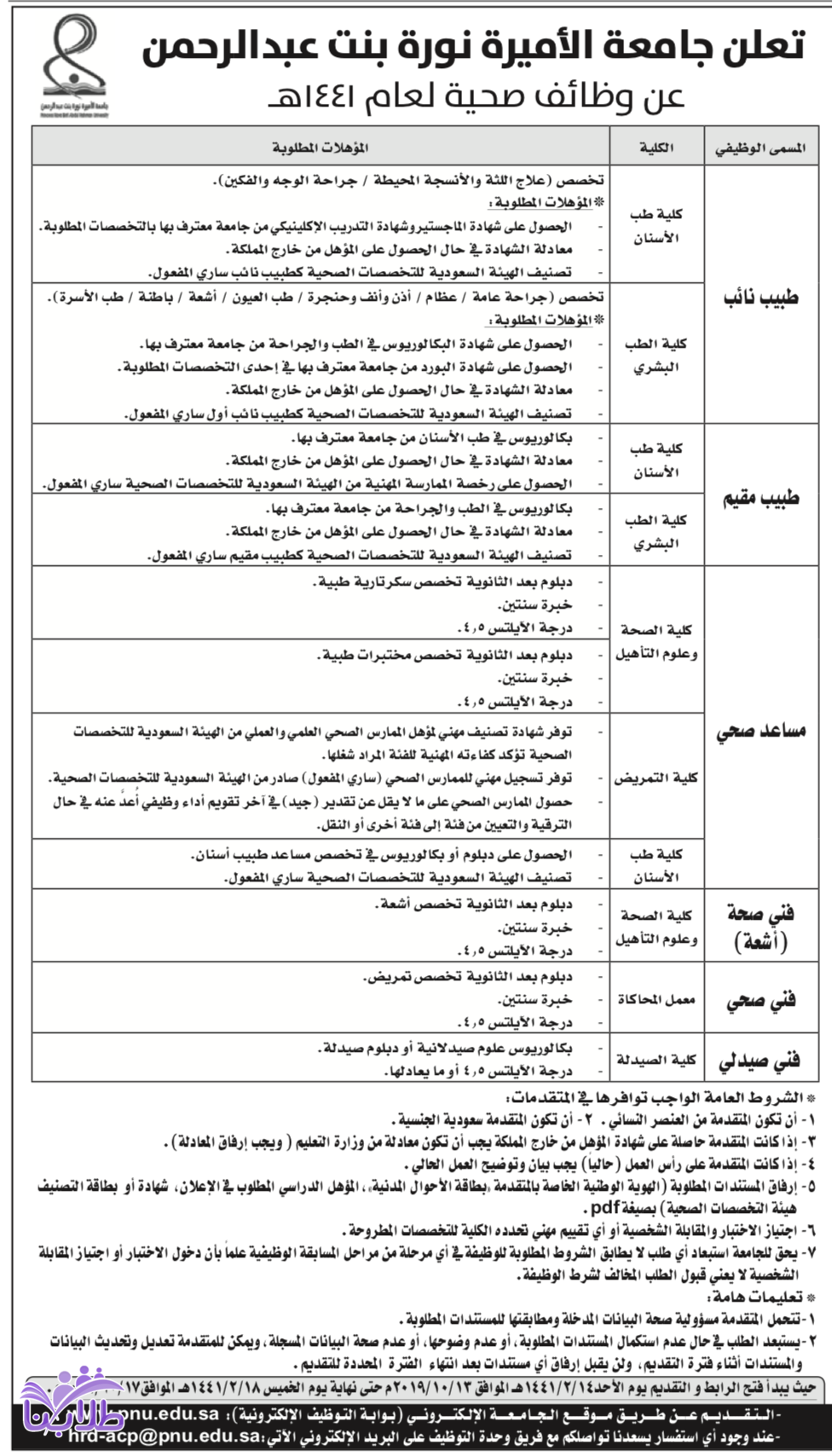 طبيب نائب (كلية الطب البشري) تخصص (جراحة عامة / عظام / أذن وأنف وحنجرة / طب العيون / أشعة / باطنة / طب الأسرة ) .