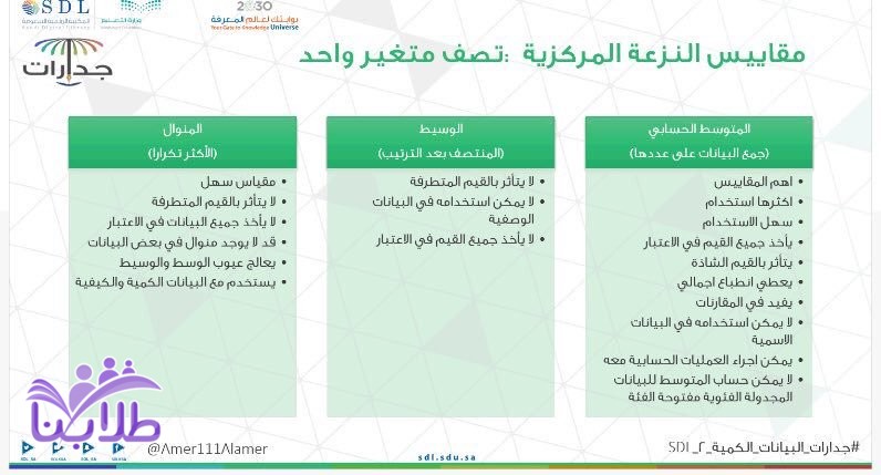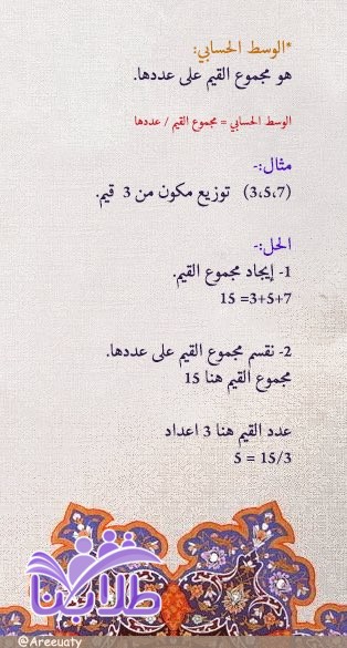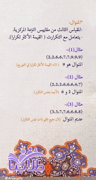 1- المنوال[القيمة التي تتكرر أكثر من غيرها في التوزيع] 2- الوسيط[القيمة التي تتوسط مجموعة من القيم بعد ترتيبها تصاعديا أو تنازليا] 3- المتوسط الحسابي[معدل القيم في توزيع معين ويتم حسابه من خلال قسمة مجموع القيم على عددها]