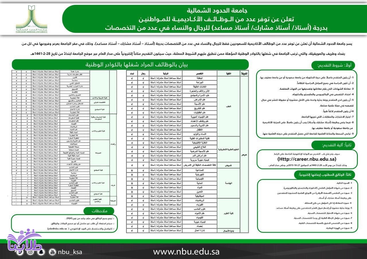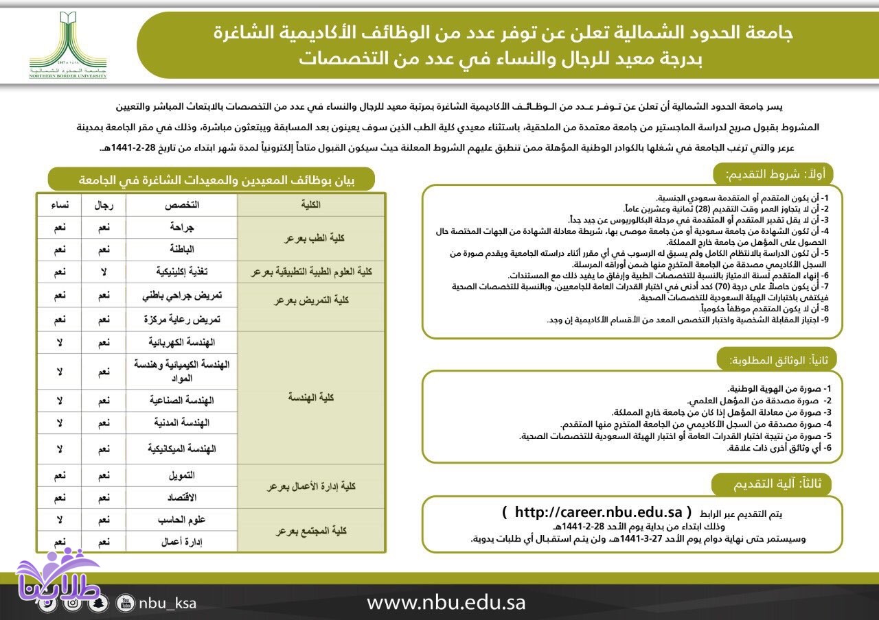 أعلنت جامعة الحدود الشمالية للجنسين على وظائف بمرتبة معيد فأعلى لمختلف التخصصات لحملة البكالوريوس والماجستير والدكتوراه