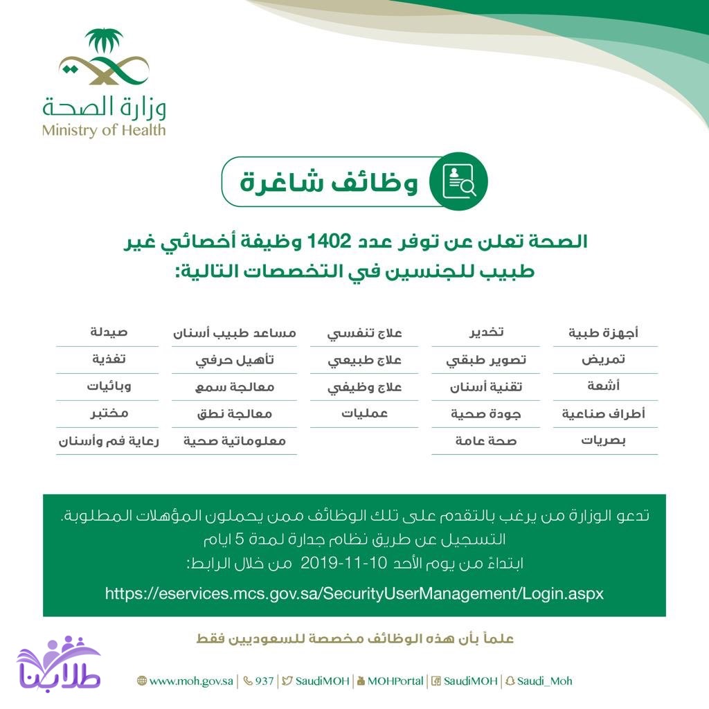 أعلنت وزارة الصحة على توفر وظائف أخصائي غير طبيب للرجال والنساء في عدة مدن ويبلغ عددها 1402 وظيفة، وتدعو الوزارة من يرغب التقدم على تلك الوظائف ممن يحملون المؤهلات المطلوبة التسجيل عن طريق نظام جدارة لمدة 5 أيام ابتداءً من يوم الأحد الموافق 2019/11/10 .
