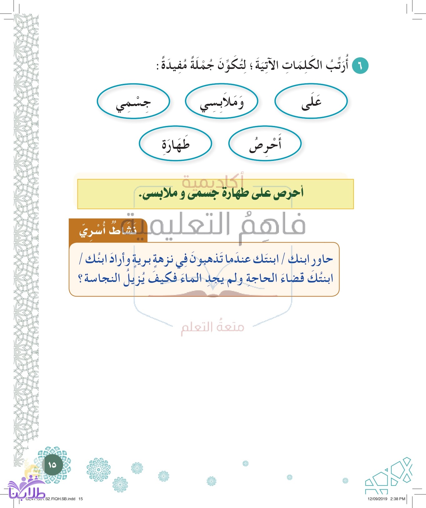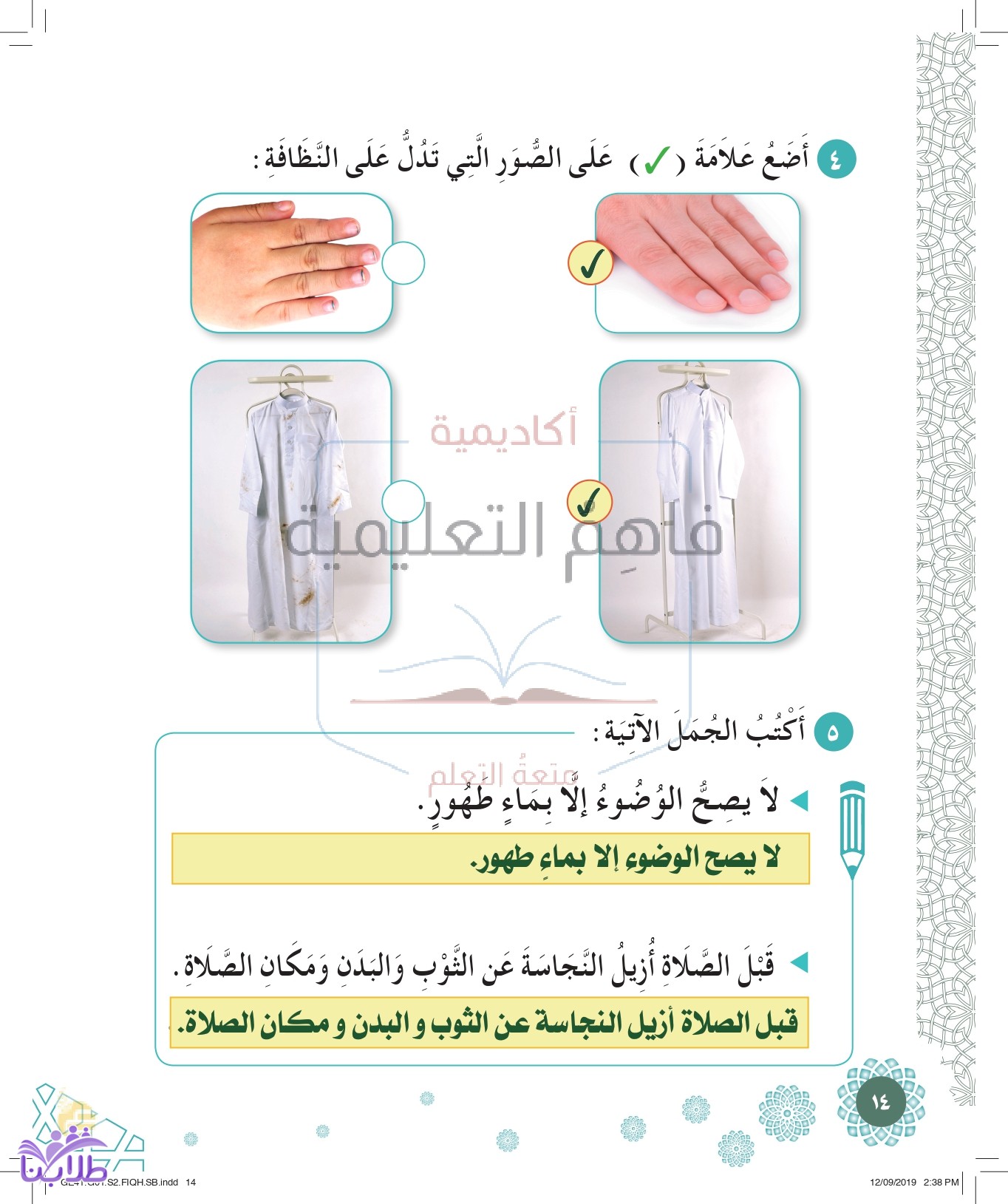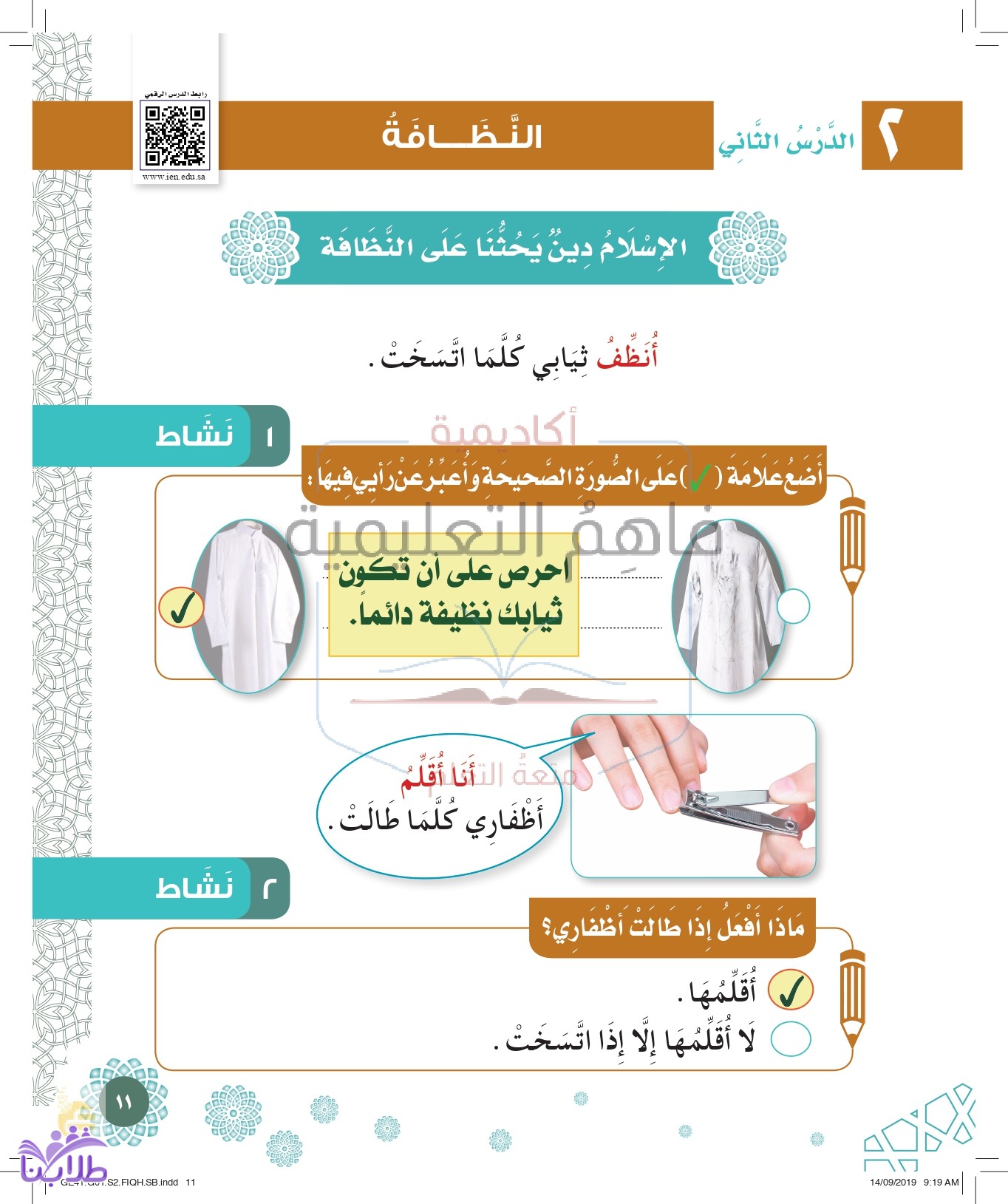 حل فقه وسلوك للصف أول ابتدائي الوحدة السابعة: الطهارة والنظافة الفصل الثاني