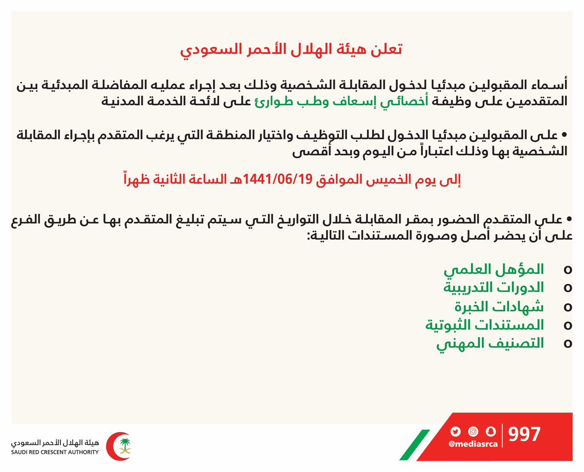 أعلنت هيئة الهلال الأحمر السعودي عن أسماء المقبولين مبدئياً لدخول المقابلة الشخصية، وذلك بعد إجراء عملية المفاضلة المبدئية بين المتقدمين على وظيفة (أخصائي إسعاف وطب طوارئ)، على لائحة الخدمة المدنية، والتي سبق الإعلان عنها من خلال موقع الهيئة، وموقع (أي وظيفة) خبر رقم (56690)، وذلك وفقاً للتفاصيل الموضحة أدناه.