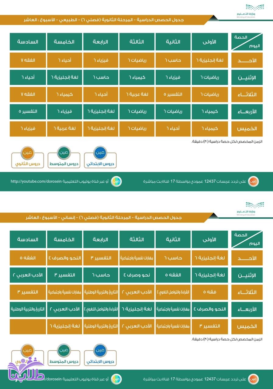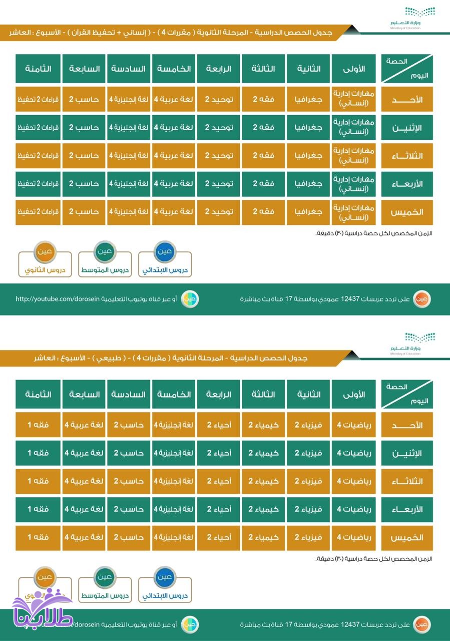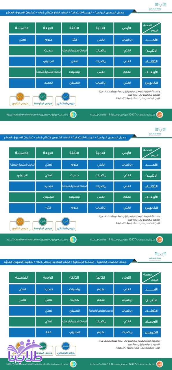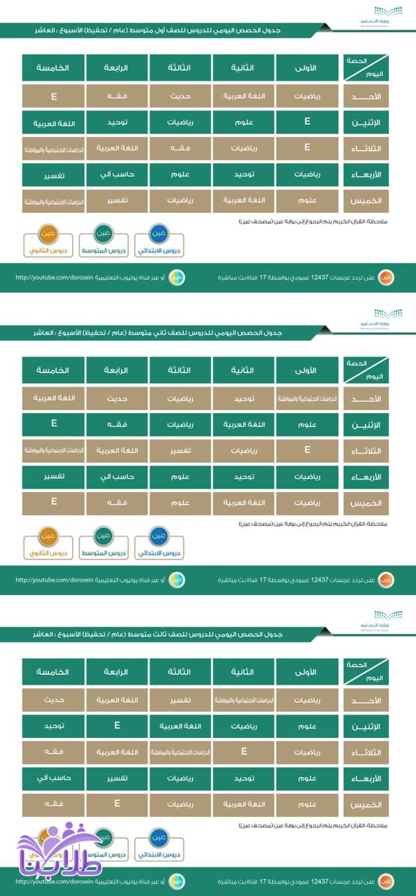 جدول الحصص اليومي لدروس الأسبوع العاشر لجميع المراحل الدراسية عبر قنوات عين تردد عربسات 12437 عمودي، في بث مباشر من الساعة 8 صباحاً إلى الساعة 12:30 ظهراً، ويُعاد طوال اليوم.