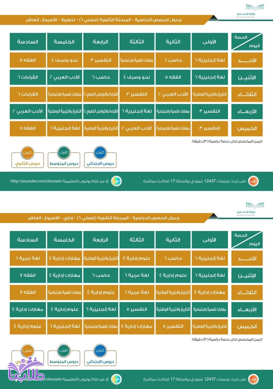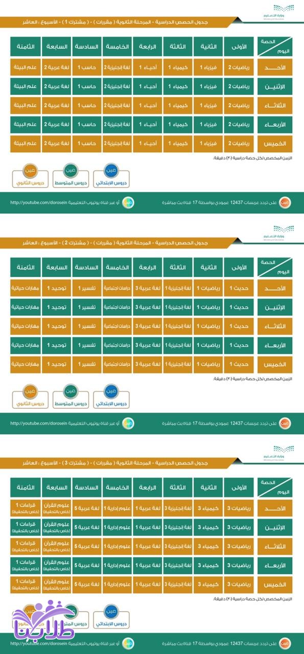 جدول الحصص اليومي لدروس الأسبوع العاشر لجميع المراحل الدراسية