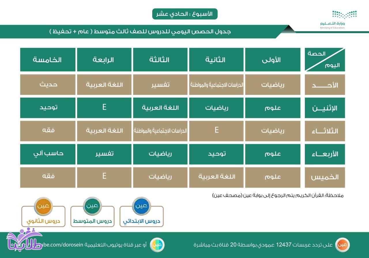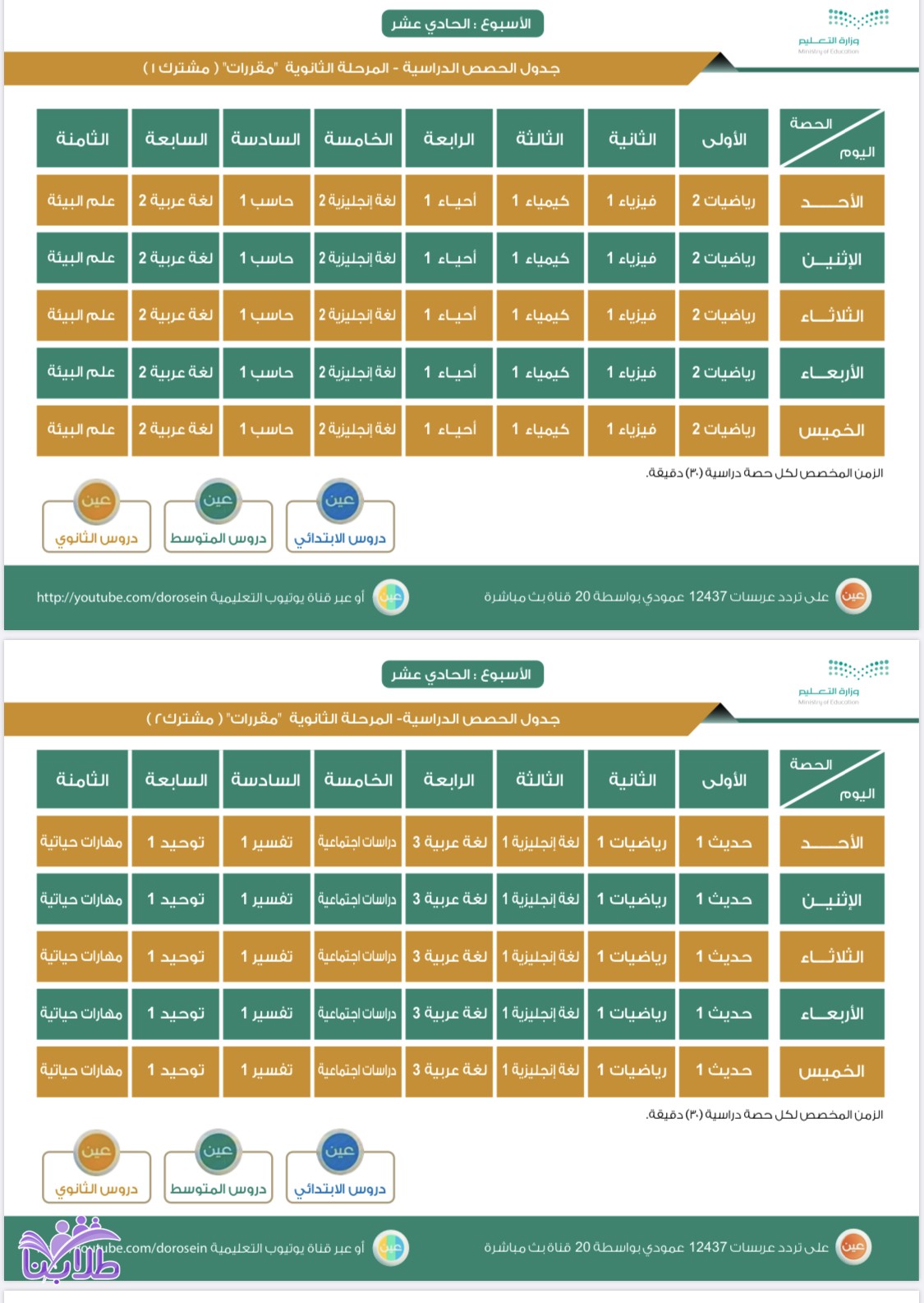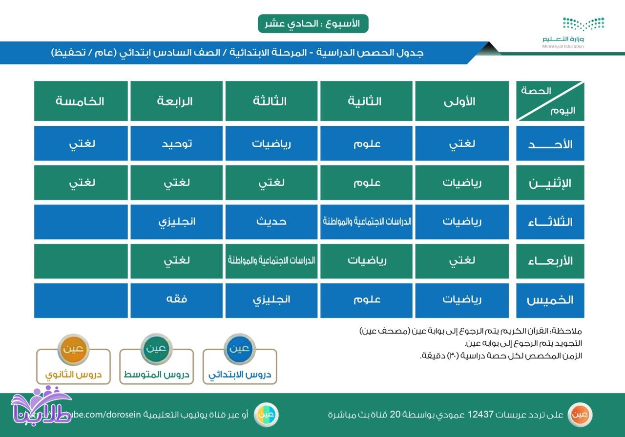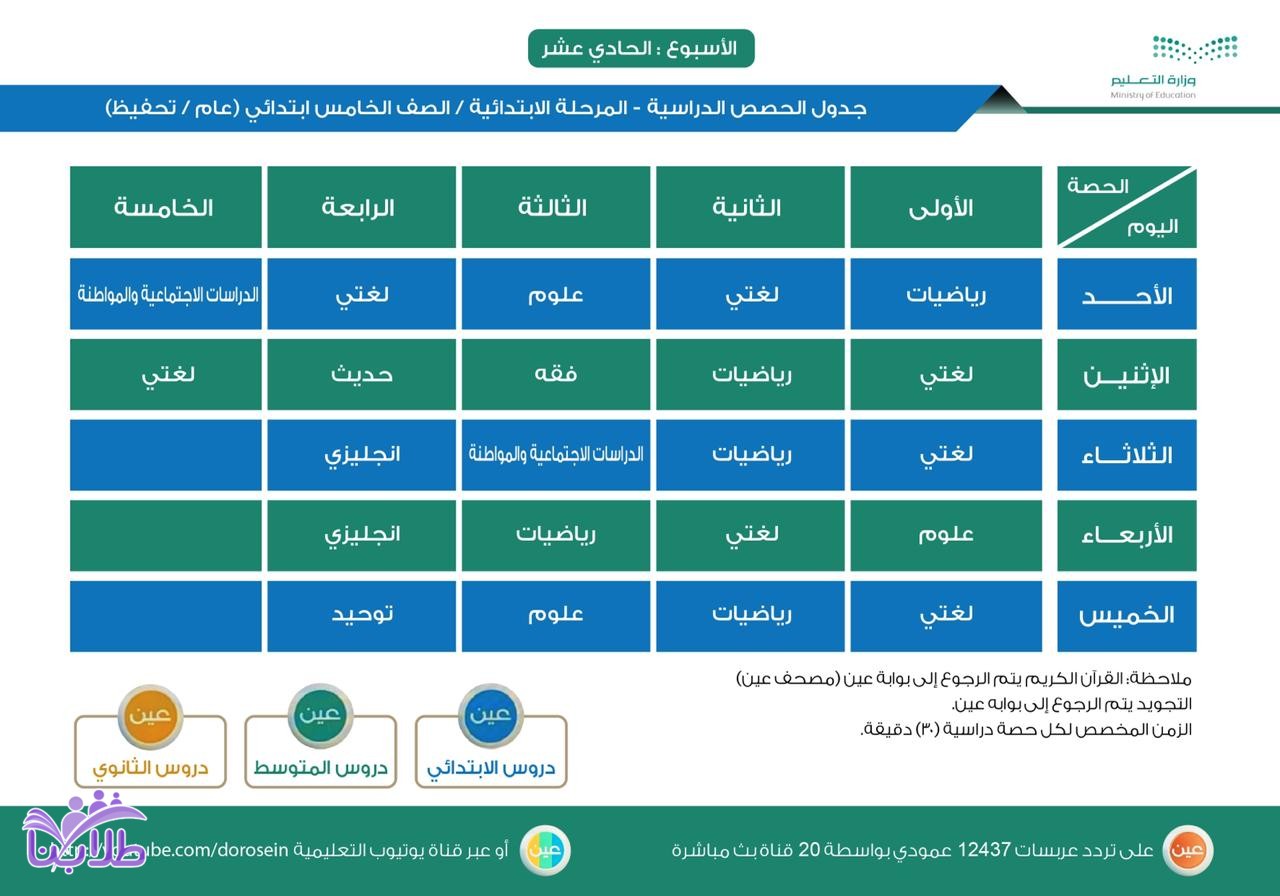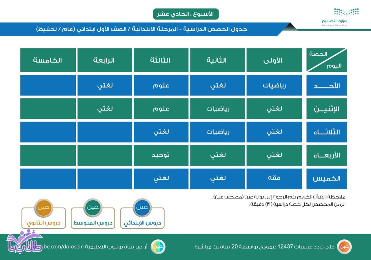 أعلنت وزارة التعليم، عن جدول الحصص اليومي لدروس الأسبوع الحادي عشر، لجميع المراحل الدراسية عبر قنوات عين على تردد عربسات 12437 عمودي، في بث مباشر من الساعة 8 صباحاً إلى الساعة 12:30 ظهراً، ويُعاد طوال اليوم، أو عبر رابط القناة على اليوتيوب (اضغط هنا).