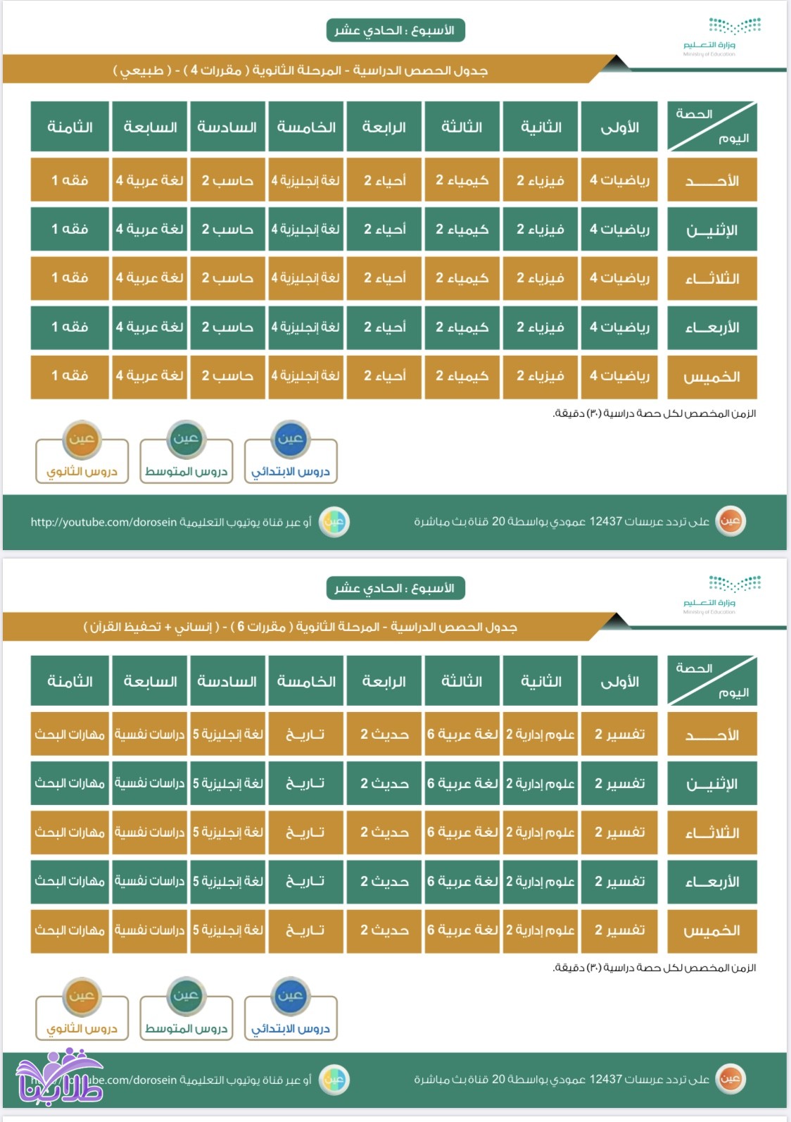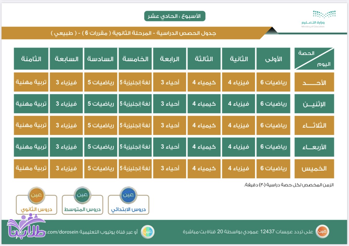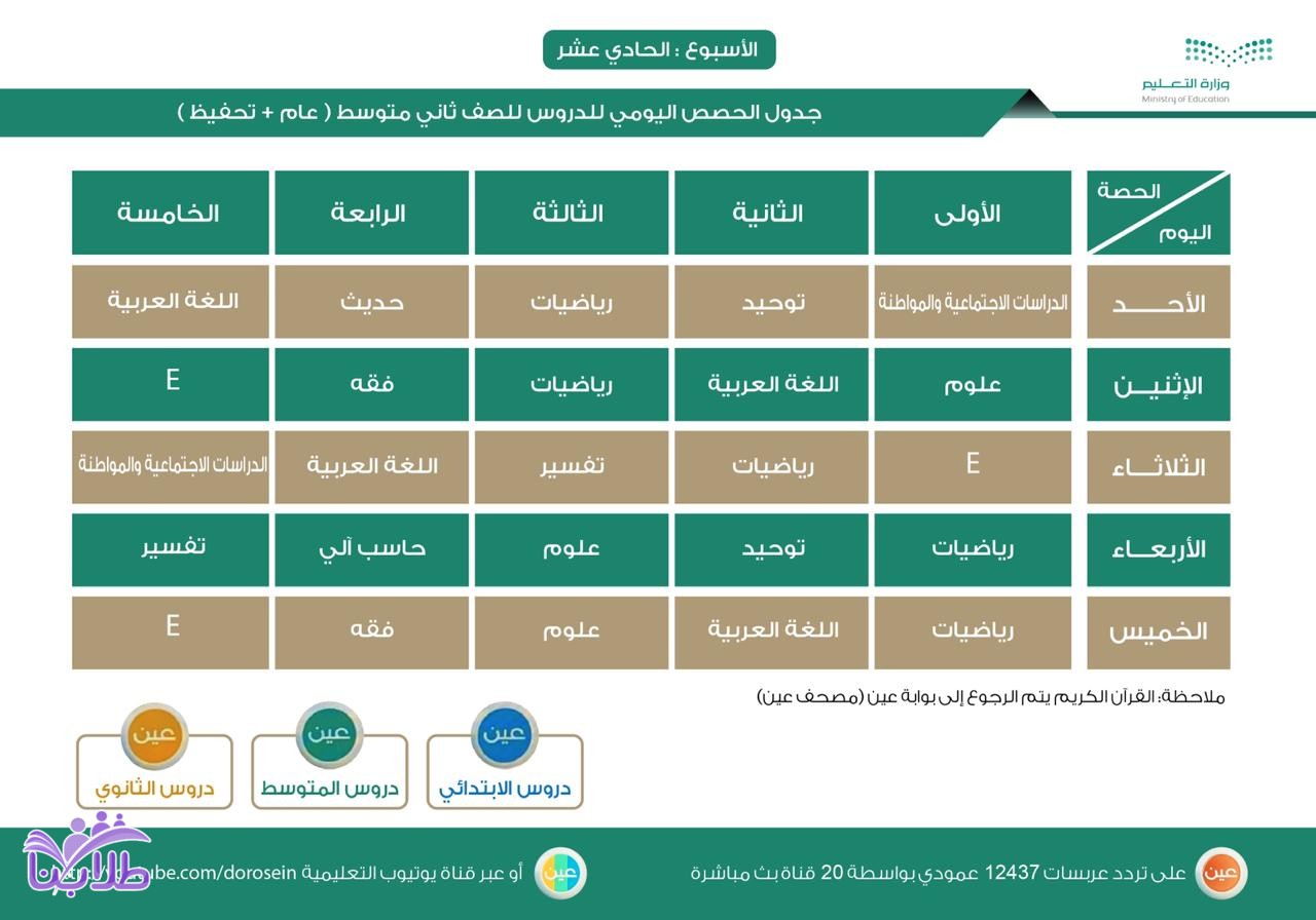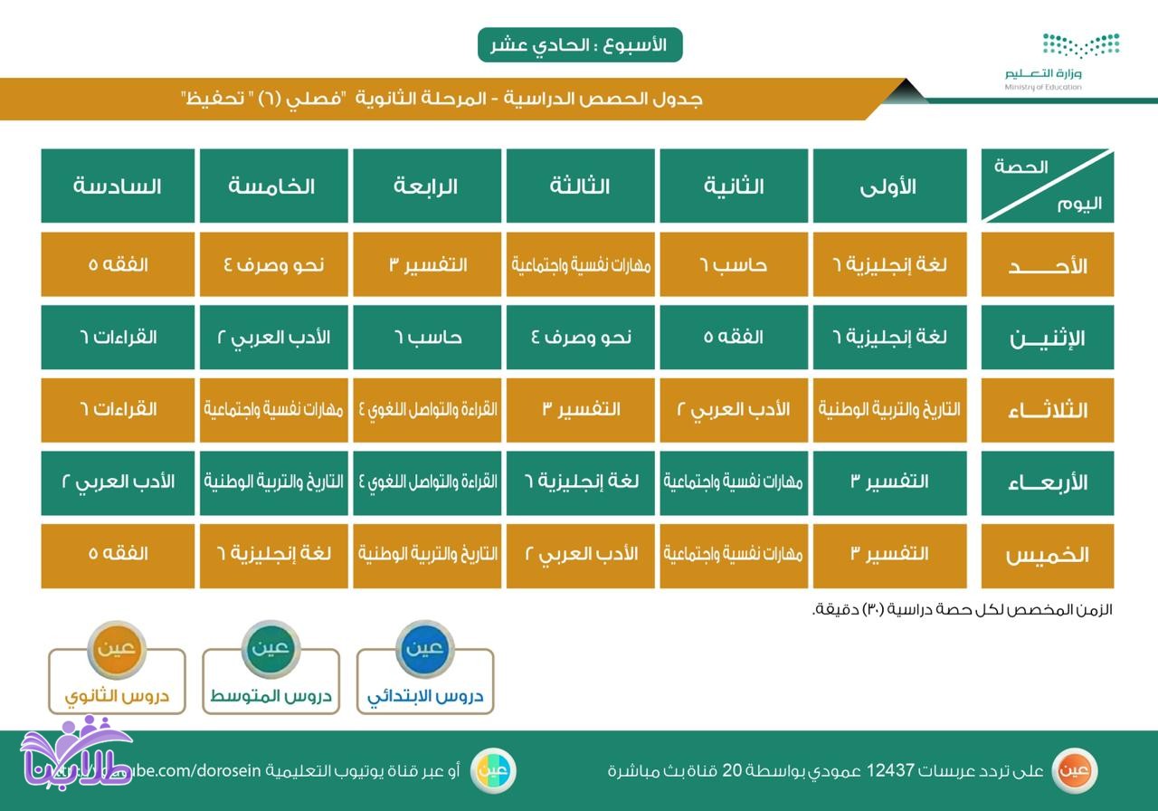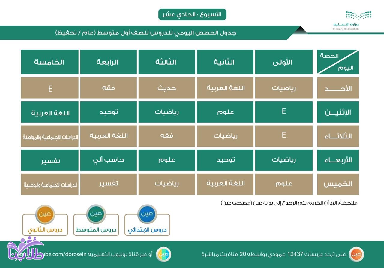أعلنت وزارة التعليم، عن جدول الحصص اليومي لدروس الأسبوع الحادي عشر، لجميع المراحل الدراسية عبر قنوات عين على تردد عربسات 12437 عمودي، في بث مباشر من الساعة 8 صباحاً إلى الساعة 12:30 ظهراً، ويُعاد طوال اليوم، أو عبر رابط القناة على اليوتيوب (اضغط هنا).