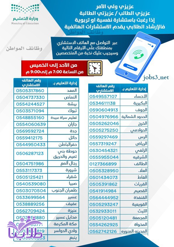 إدارة الإرشاد الطلابي بوزارة التعليم تعلن عن ارقام الاستفسارات على الاسئلة التربوية والنفسية