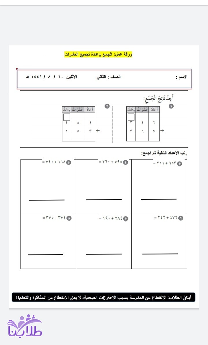 ورقة عمل في درس الجمع من مادة الرياضيات للصف الثاني الإبتدائي 2020/1441