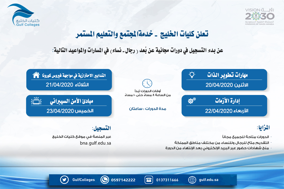 دورات مجانية للرجال والنساء عن بعد بكليات الخليج