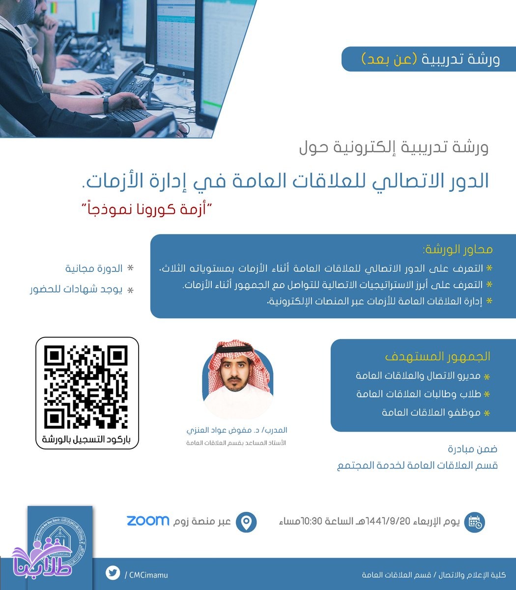 فتح باب التقديم في دورة تدريبية عن بعد بجامعة الإمام محمد بن سعود الإسلامية تحت عنوان “الدور الاتصالي للعلاقات العامة في إدارة الأزمات”