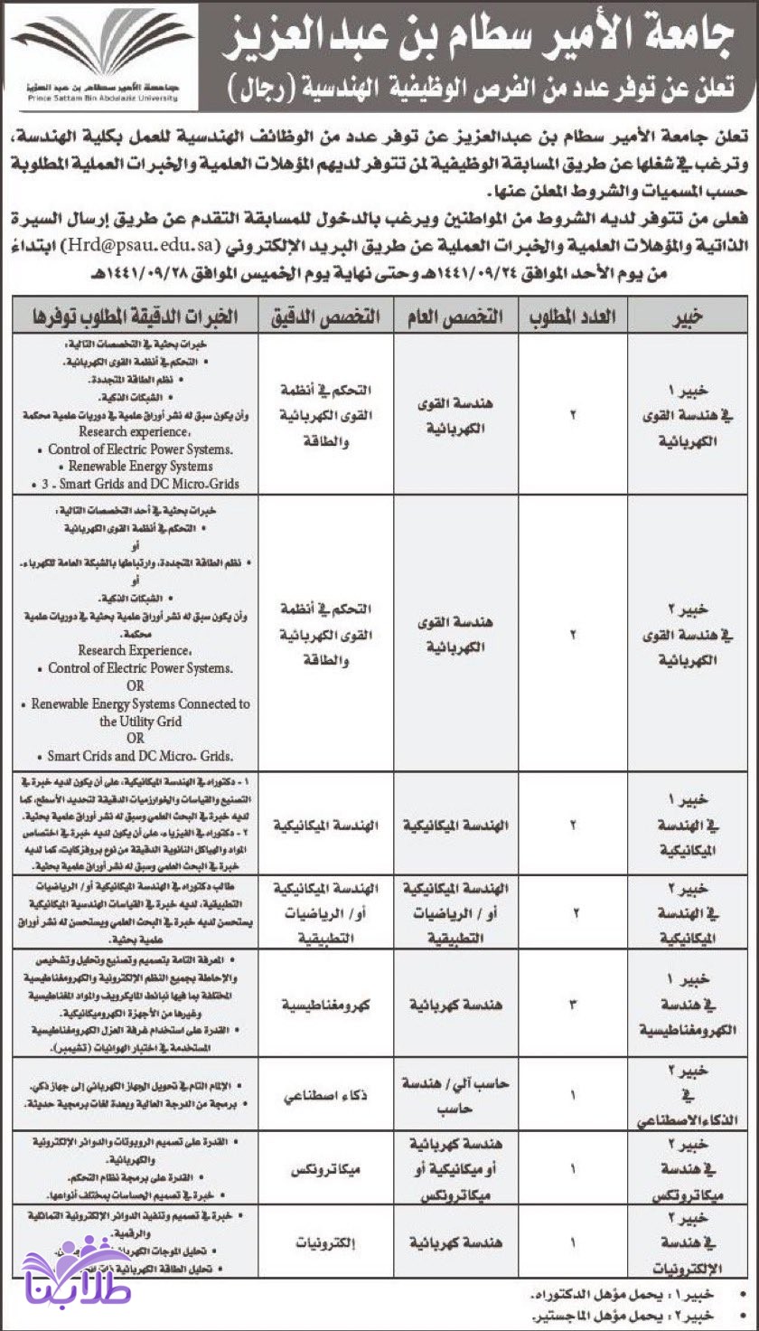 مسابقة وظيفية على وظائف هندسية بجامعة الأمير سطام لحملة الماجستير و الدكتوراه بالتخصصات الهندسية (قوى كهربائية، ميكانيكية، كهرومغناطيسية، ذكاء اصطناعي، ميكاترونكس، إلكترونيات)