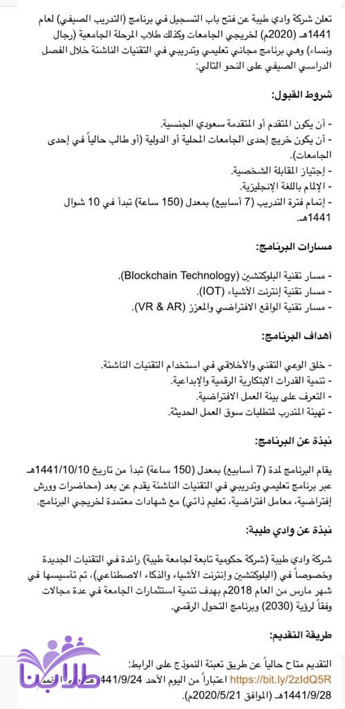 فتح باب التقديم ببرنامج التدريب الصيفي للخريجين والطلاب لعام 1441هـ بوادي طيبة التابعة لجامعة طيبة
