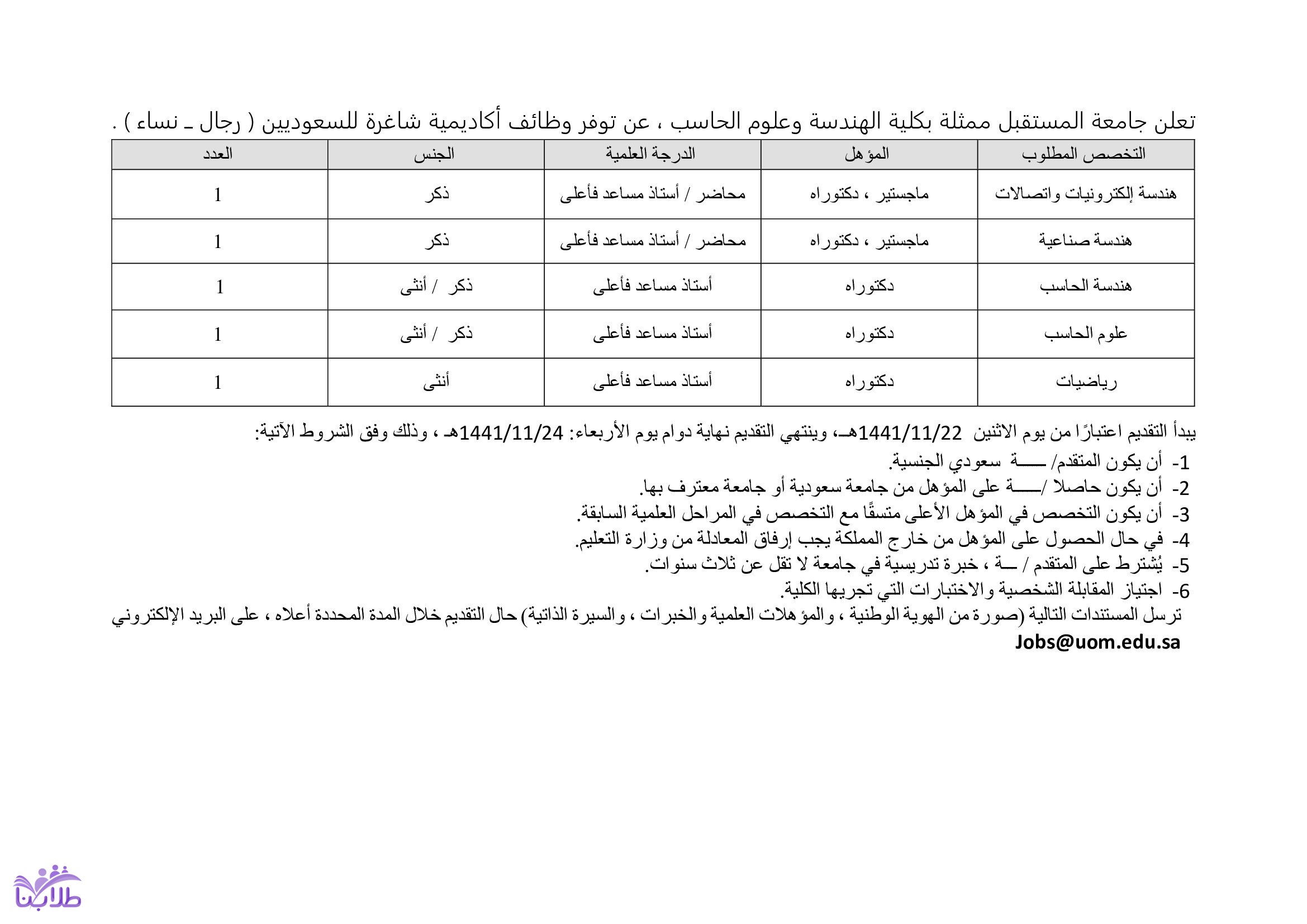 ترسل المستندات التالية (صورة من الهوية الوطنية، والمؤهلات العلمية والخبرات، والسيرة الذاتية) على البريد الإلكتروني :