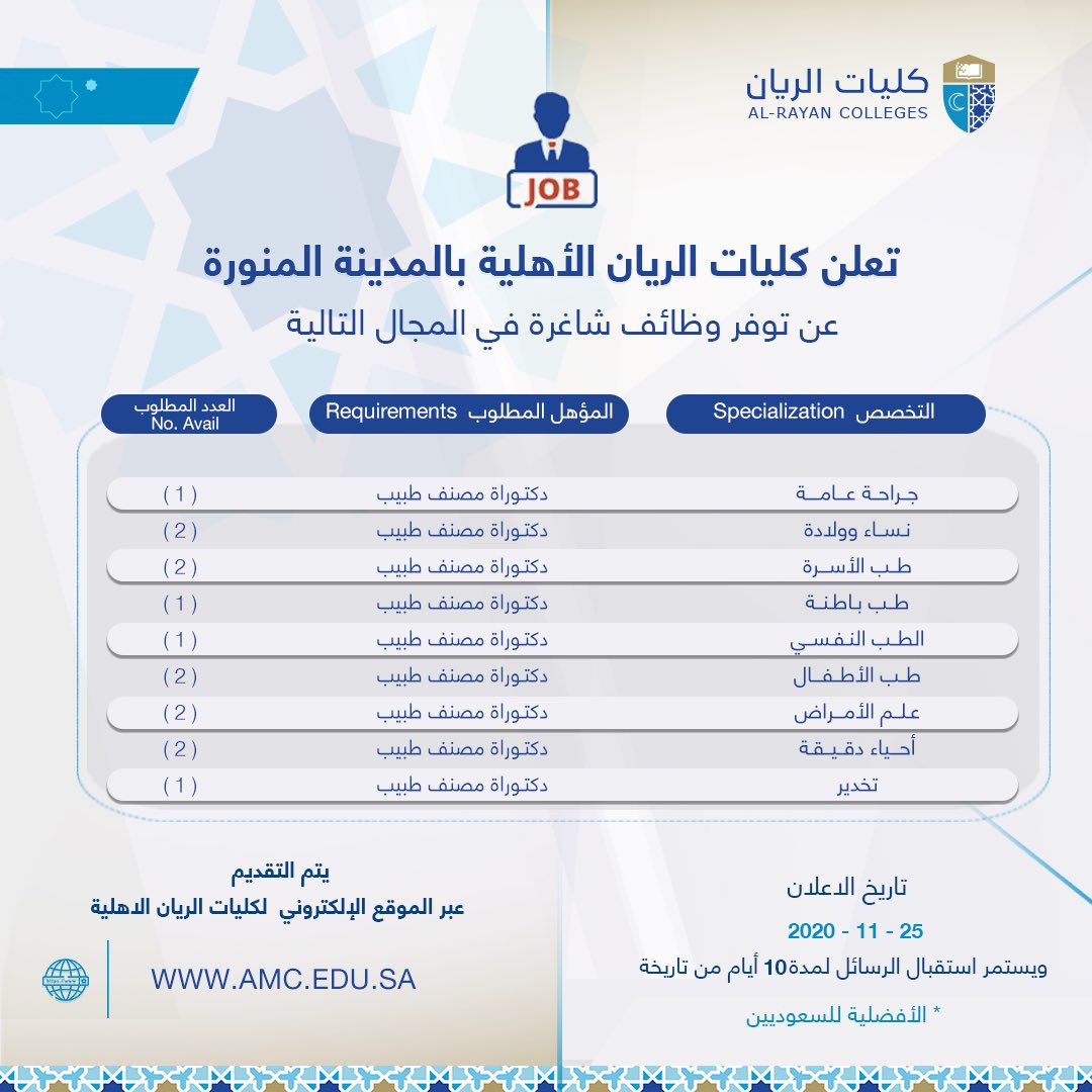 توفر 10 وظائف شاغرة في كليات الريان الأهلية بالمدينة لحملة الدكتوراه (للجنسين)