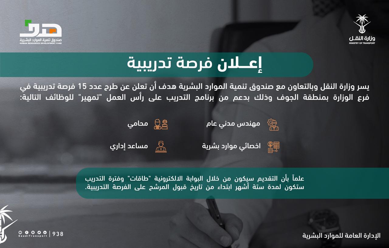 تعلن وزارة النقل عبر موقعها الإلكتروني 57 فرصة تدريبية شاغرة بعدة مناطق بالمملكة عبر (تمهير)، وذلك حسب التفاصيل وطريقة التقديم الموضحة أدناه.