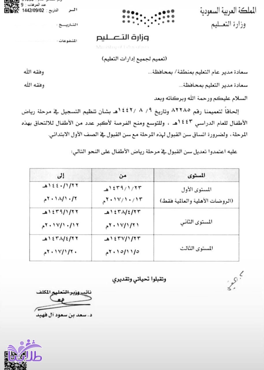 وزارة التعليم تصدر تعميماً بتعديل سن القبول في مرحلة رياض الأطفال