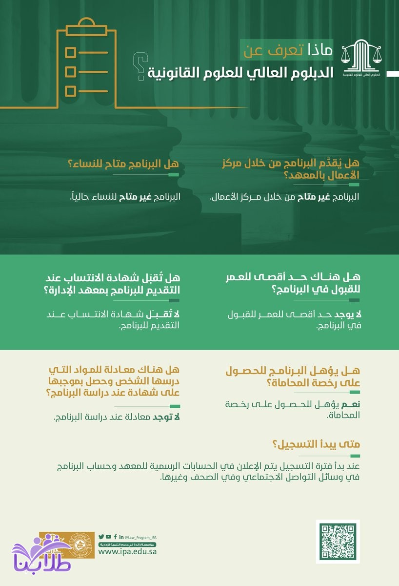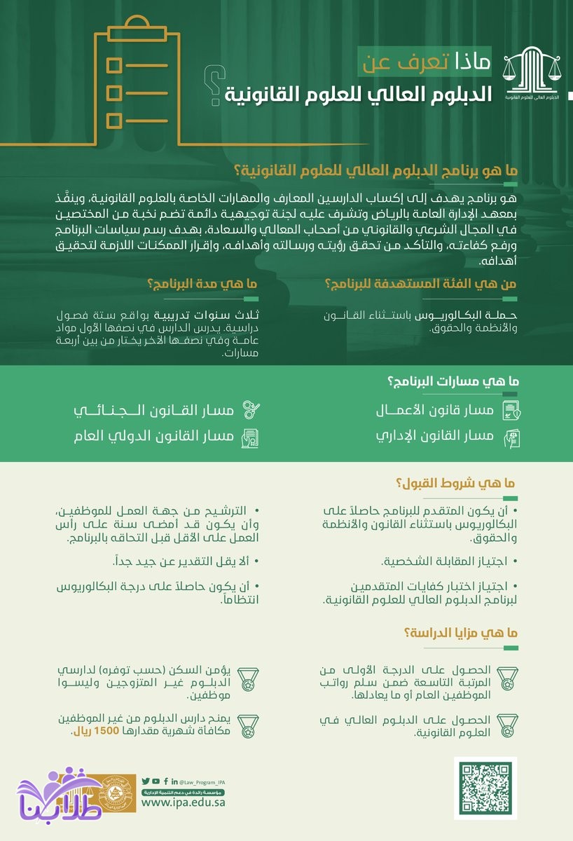 أعلن معهد الإدارة العامة عن تفاصيل الدبلوم العالي للعلوم القانونية الذي يمنح المشارك دبلوم عالي في القانون ويؤهله للحصول على رخصة المحاماة والدرجة الأولى من المرتبة التاسعة