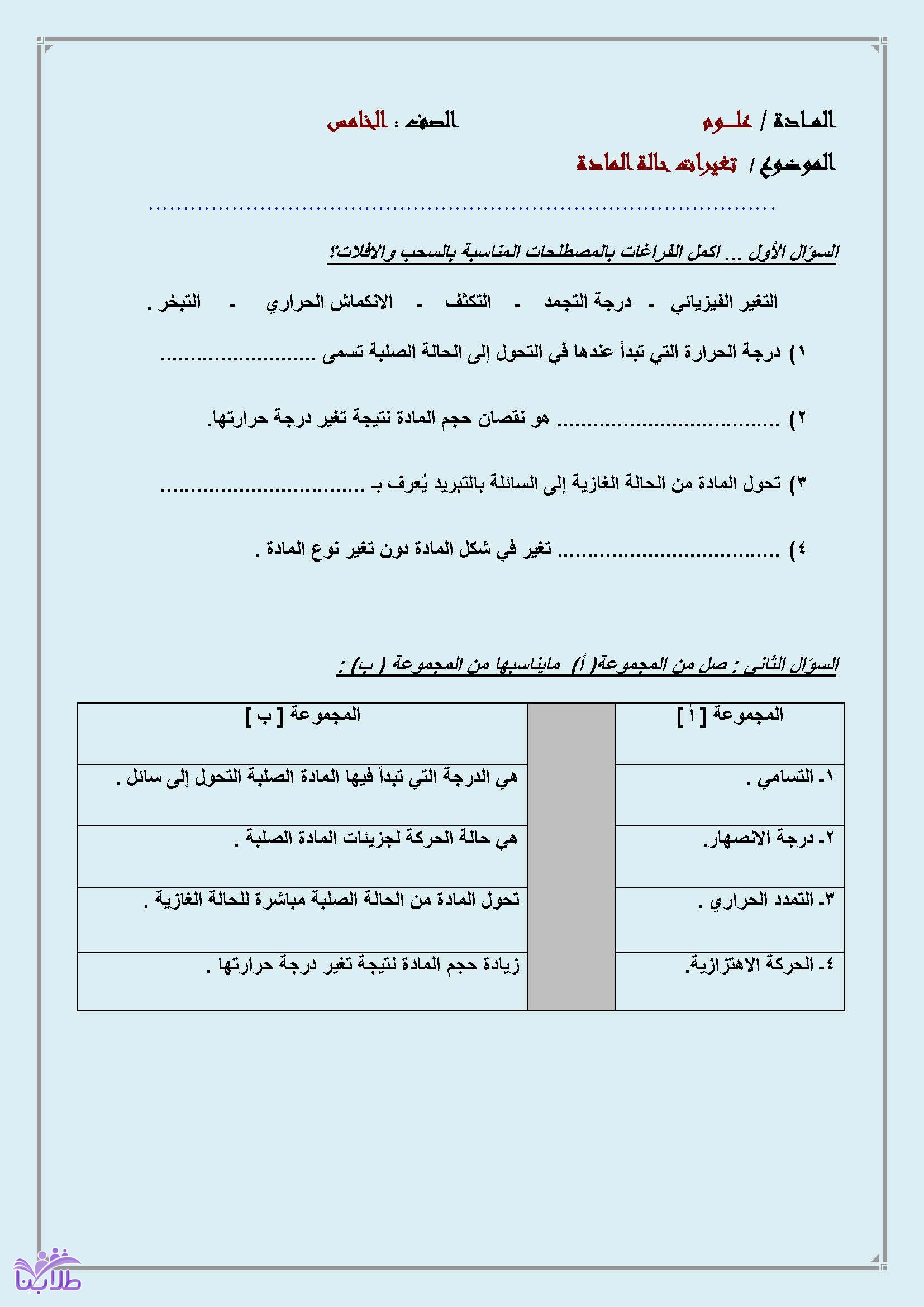 تحميل ورقة عمل درس تغيرات حالة المادة خامس ف3