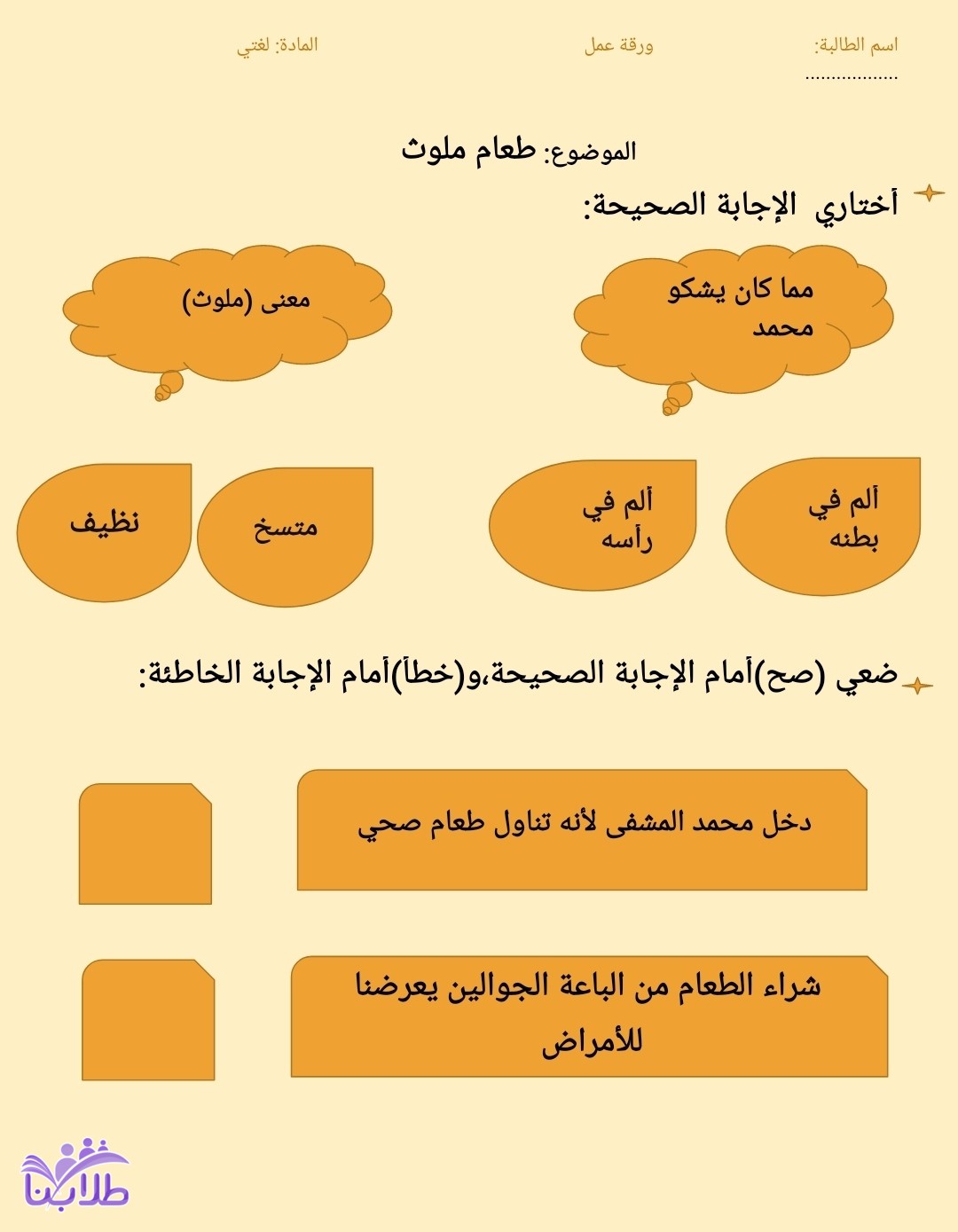 ورقة عمل درس طعام ملوث 5 لغتي اول ابتدائي ف3