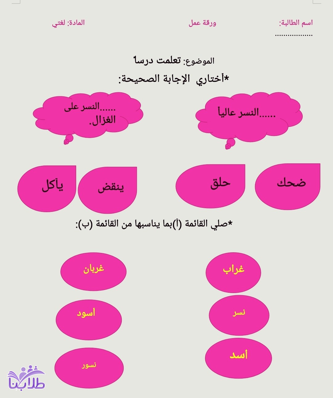 ورقة عمل درس تعلمت درساً لغتي اول ابتدائي ف3