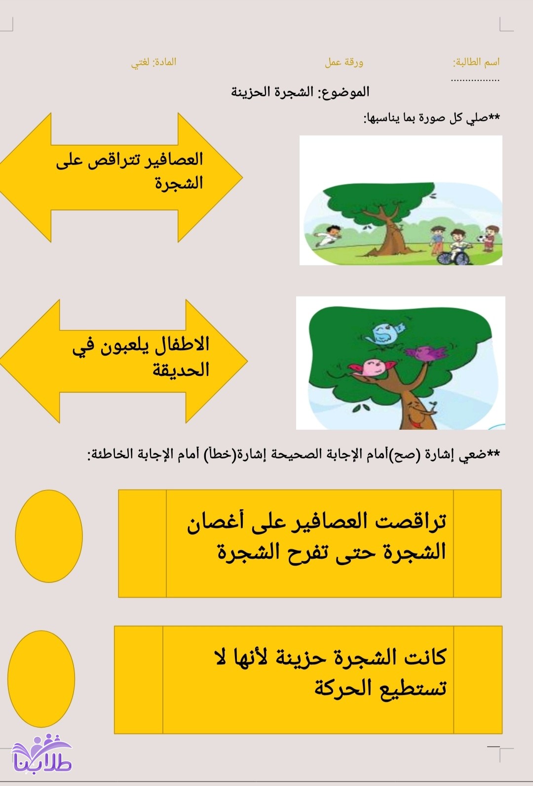 ورقة عمل درس الشجرة الحزينة لغتي اول ابتدائي ف3