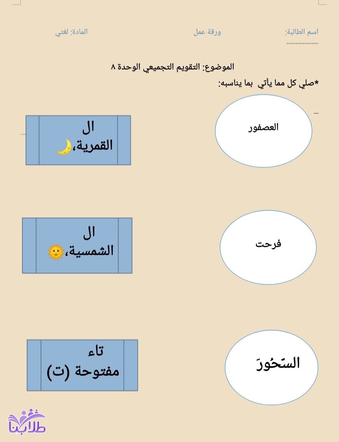 ورقة عمل التقويم التجميعي الوحدة الثامنة مناسبات لغتي اول ابتدائي ف3