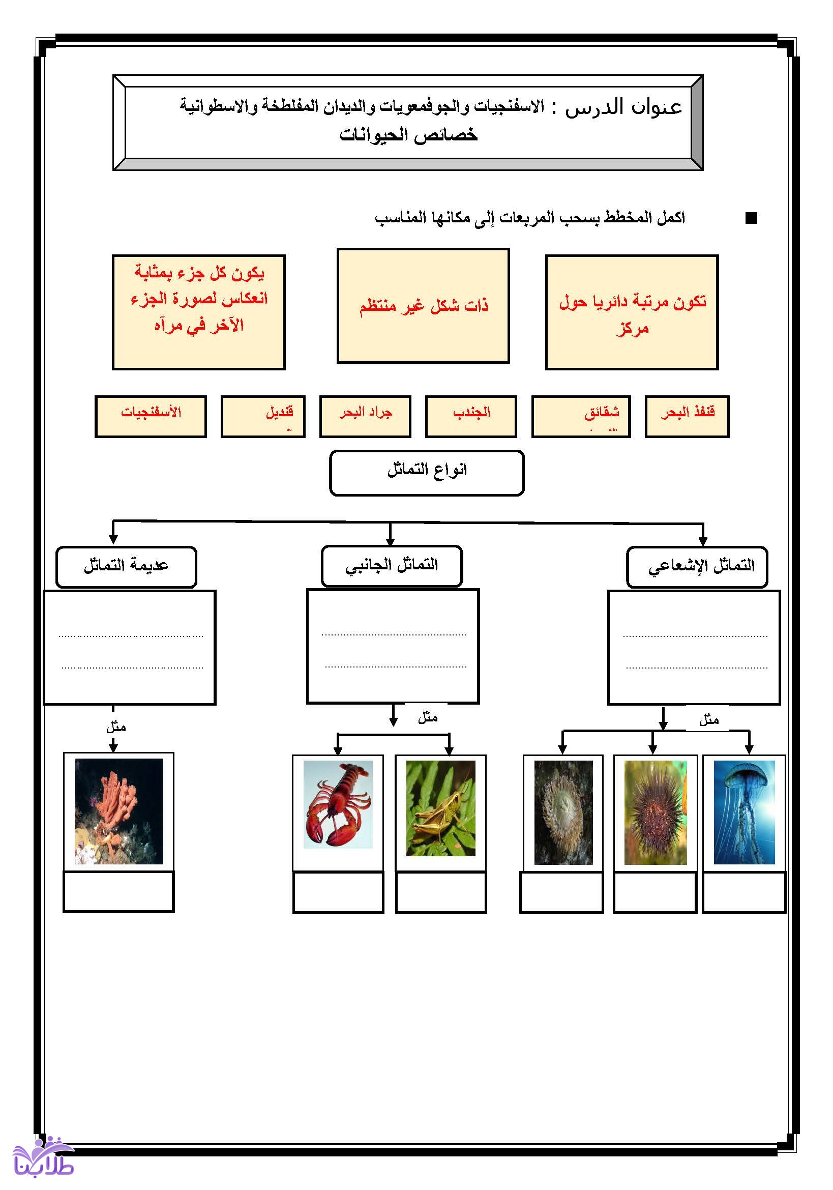 ورقة عمل درس الاسنفنجيات والجوف معويات والديدان المفلطحة والاسطوانية علوم اول متوسط